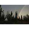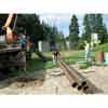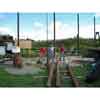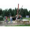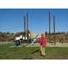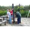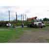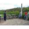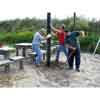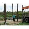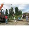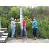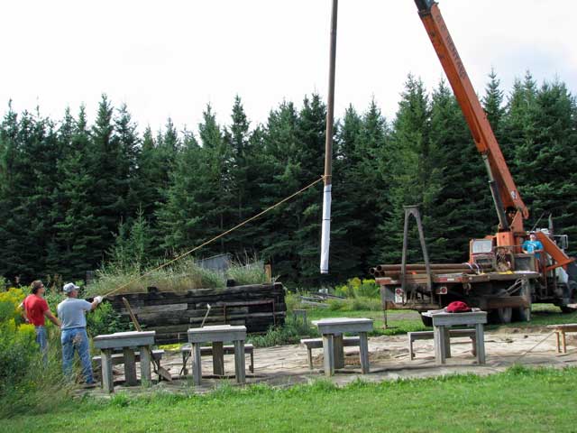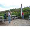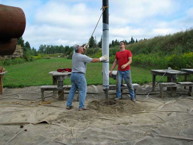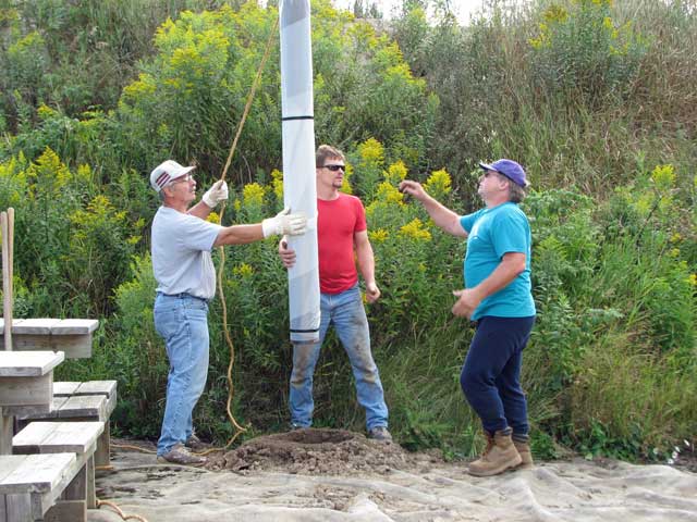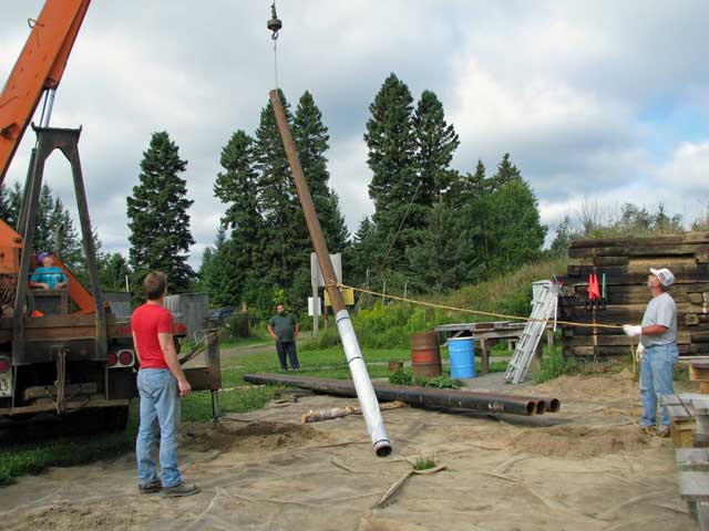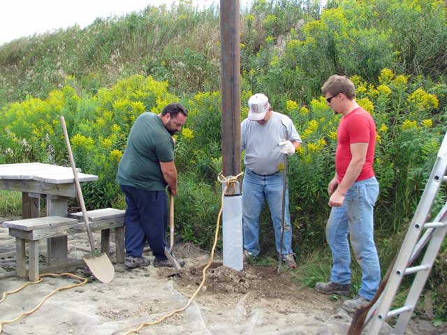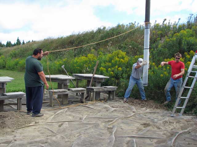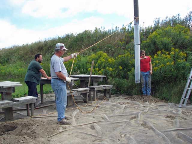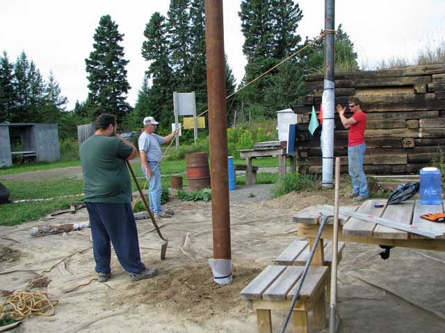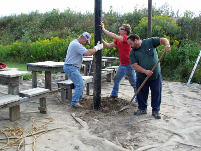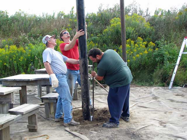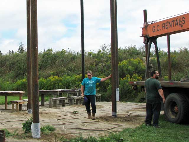 --- Each pole was lifted and guided into position, and then lowered and coaxed into alignment; the hole was filled and firmly tamped. Final vertical alignment will take place when more upper structure is added before the roof goes on.