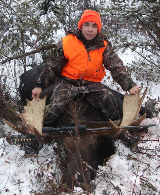 Mark B. reports: "Here is a picture of Junior shooter Judah B.'s first moose. Judah is 12 years old and in his first year with the club. He shot his bull on November 16, 2010 at 300+ yards using a 30-06 with a 220 grain bullet."