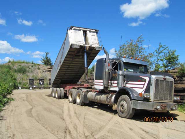 Some comments from Terry afterwards: "The 29th of June I went to the Conmee pit to actually see what we were going to get for product, and arranged with truck drivers to dump the 1st load around 9:30 a.m., June 30th, before rain set in. Dump truck round trips were 1 1/2 to 2 hrs between truckload dumps (4 of them).