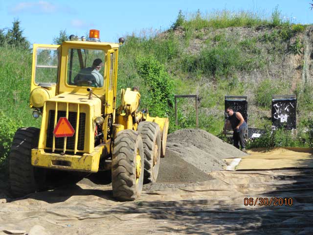 --- Our landlord and fine member Wade W. phoned our range rep Terry D. to say he had just arranged a truck and loader and 100 metric tonnes of fine gravel were being delivered. So these two valiant members along with Wayne H. proceeded to the pistol range and had at it. Yes they had a loader for part of the work, but there was still an awful lot of back-breaking manual shovel work spreading and packing.