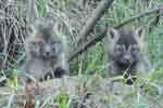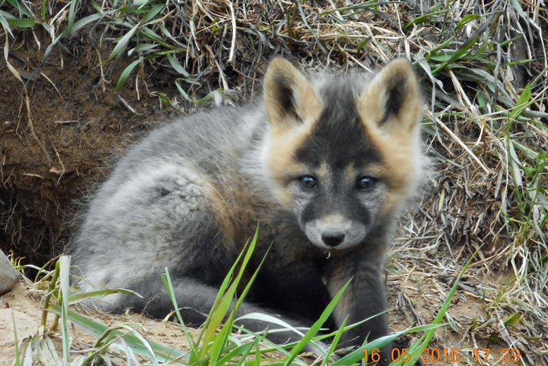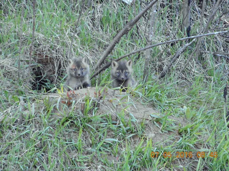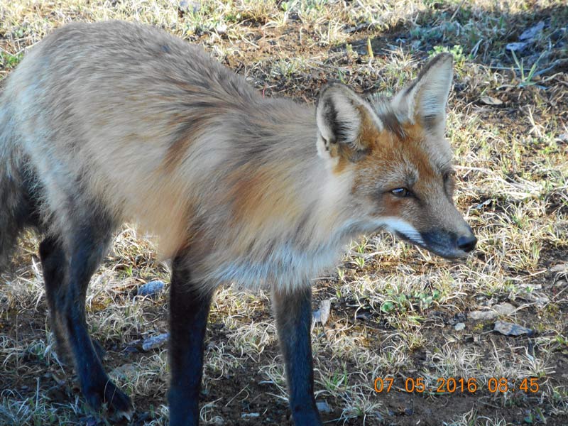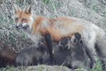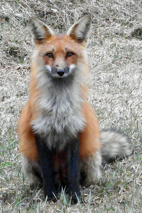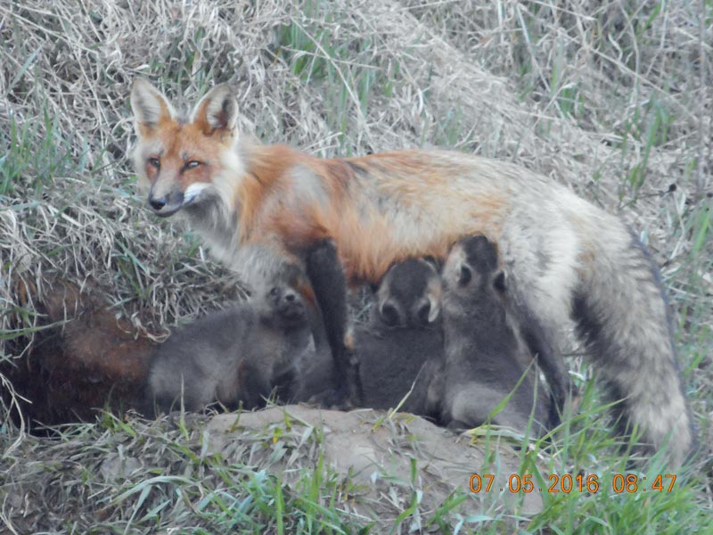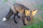 Barry E. has befriended a female Red Fox. In Mid May, Don M. took some fine pix of this mother and her young kits. He took this later photo at end July of one of the nearly grown kits. [Canadian "red" foxes can come in any range of colours from the typical mostly red, to black or silver or a mixture.]
