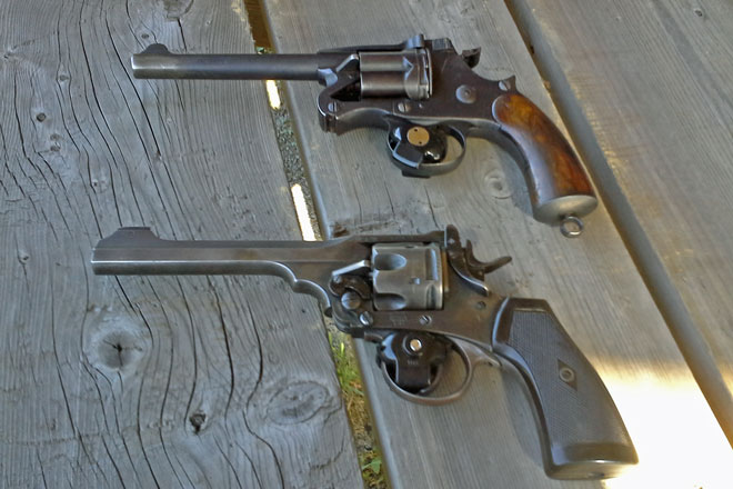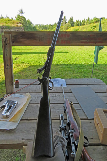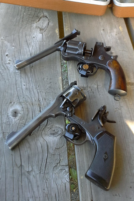 On 02 July that Whitney Kennedy .45-60 was back and Gerry had loaded a suitable case with 60 grains of black powder. Jordan used it to punch a neat hole at 100 metres near target center. Also present were an 1884 Mark 2 Enfield revolver in .476 that had been issued to the N.W.M.P. (North West Mounted Police), and a Webley revolver in .455 that was very accurate at 10 metres, as tested by Gerry and myself. One photo shows the difference in ejection systems for these two revolvers.