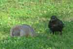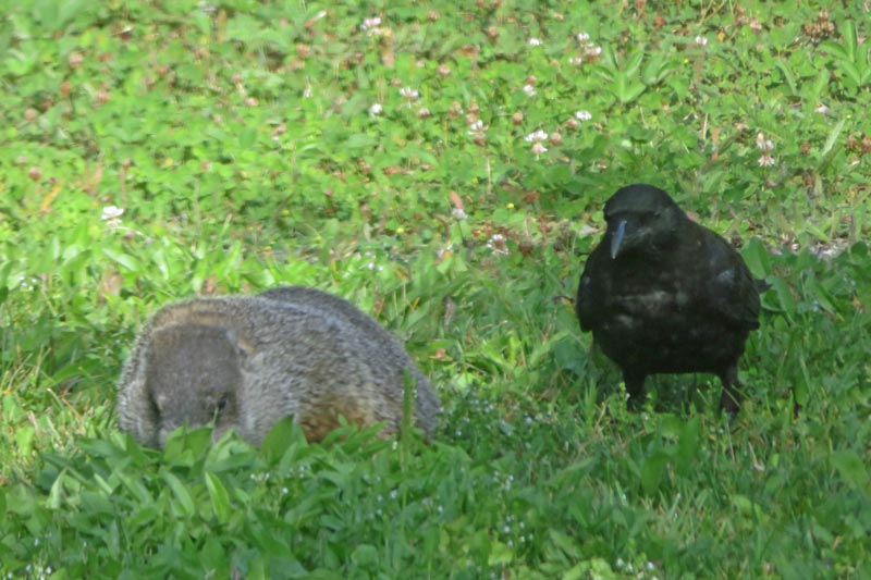 On 01 August, while I was writing a newsletter, a Groundhog in my yard tolerated the close company of a baby Crow who was following him for several minutes, despite the occasional attempts by the baby to pluck out some fur.