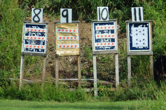 A target for this event consists of five 2" clay discs that are glued to a backing and attached to the 100 yard target frames.