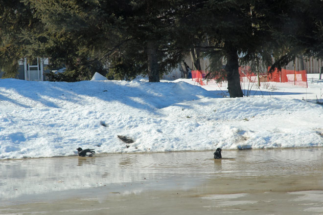 The last photo was taken at the end of the show, as the weather finally turned sunny and there were small lakes everywhere including this one in the parking lot -- where crows were bathing happily in what was still frigid water -- tough Northwestern Ontario Crows.